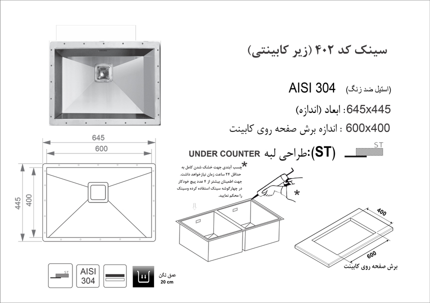 سینک ظرفشویی زیرکار اخوان مدل 402