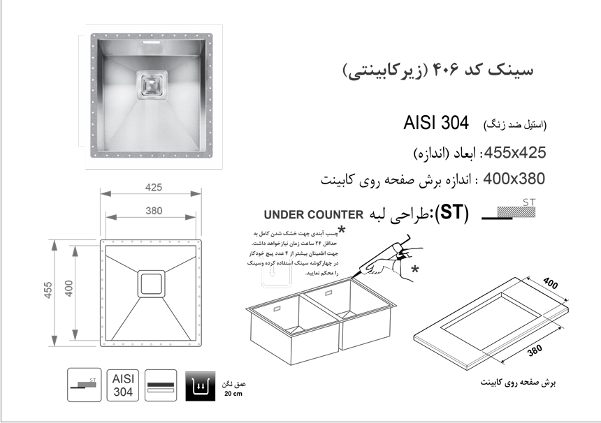 سینک ظرفشویی زیرکار اخوان مدل 408